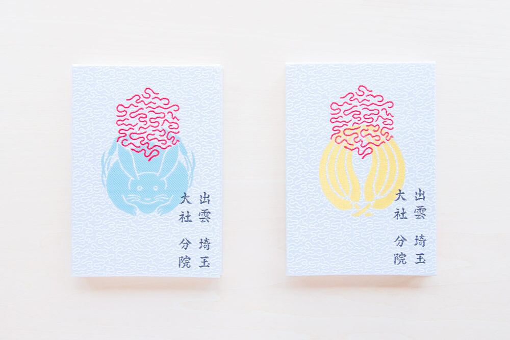 「大しめ縄と御社殿」「荒船神社と後ろ向き三つ並び兎」「蒲に兎と梛の葉」の三種類ございます。